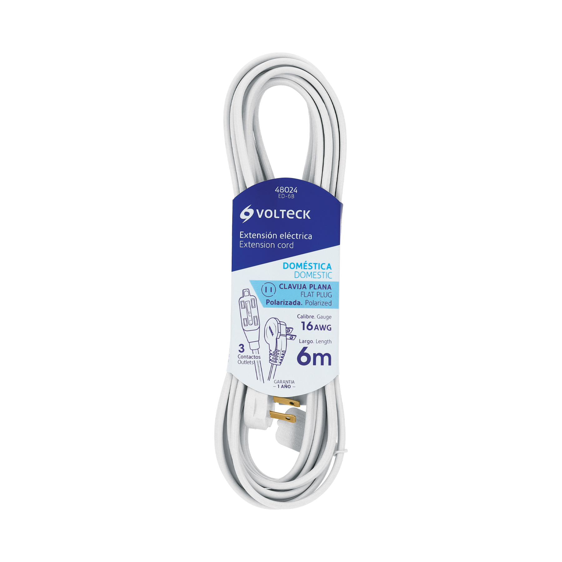Extensión eléctrica doméstica 6 m clavija plana, blanca